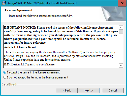 - Umístění instalace ponechte to, které je předvolené - C:\Users\Public\IMSIDesign\DesignCAD 3D Max 2025 64-bit, >> zvolte Next (další) Poznámka: Na systému Windows 11 se složka místo Public může zobrazovat jako Veřejné. Neberte na to ohled, instalace by měla proběhnou správně.