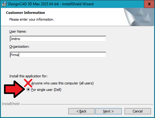 C:\DesignCAD FALEK\FULL DesignCAD 3D Max 2025 (v32) na soubor SETUP.EXE. Následně se vás systém zeptá: