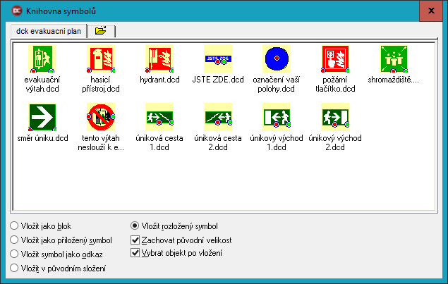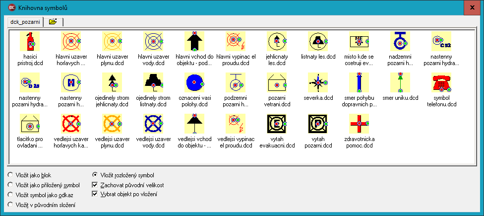 > Obsahuje vybrané symboly z podkladu Ministerstva vnitra - "Metodický návod k vypracování dokumentace zdolávání požárů", autor Ing. Zdeněk Hanuška = celkem 32 ks. Výběr může být bude doplněn o další značky. Tuto knihovnu nahrazuje DCk ZDOLÁVÁNÍ POŽÁRU.