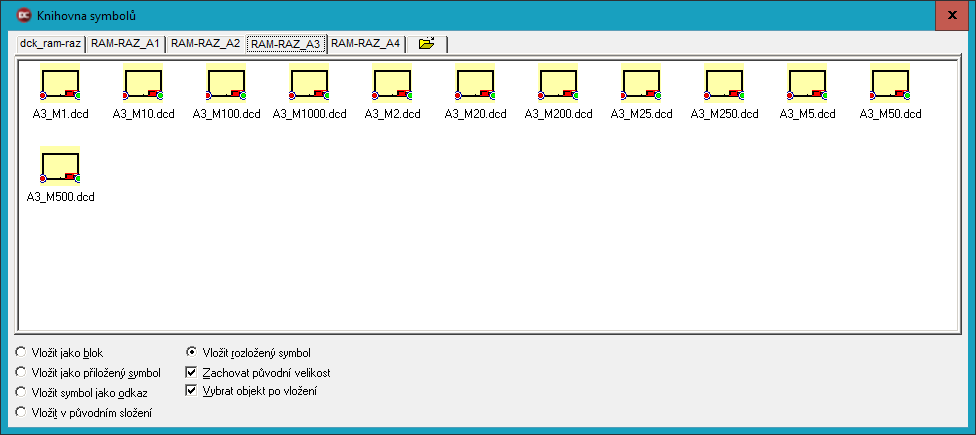 > Rámečky jsou ve formátu DCD, obsahují symbol rohového razítka, propojeného s originálem kresby (soubor se vzorovým razítkem). Editace takové šablony výkresu pro konkrétní zakázku se tedy následně projeví v každém rámečku, které připojíte k výkresu.