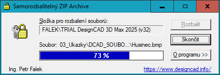 Po kliknutí na instalaci češtiny se tato automaticky rozbalí do nastavené složky C:\Users\Public\IMSIDesign\DesignCAD 3D Max 2025 64-bit a zároveň je dán příkaz aby se spustil program DesignCAD pomocí hlavního programového souboru Dcad32x64.exe.
