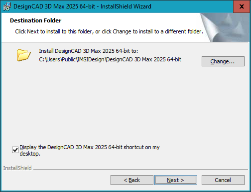 - Umístění instalace ponechte to, které je předvolené - C:\Users\Public\IMSIDesign\DesignCAD 3D Max 2025 64-bit, >> zvolte Next (další)